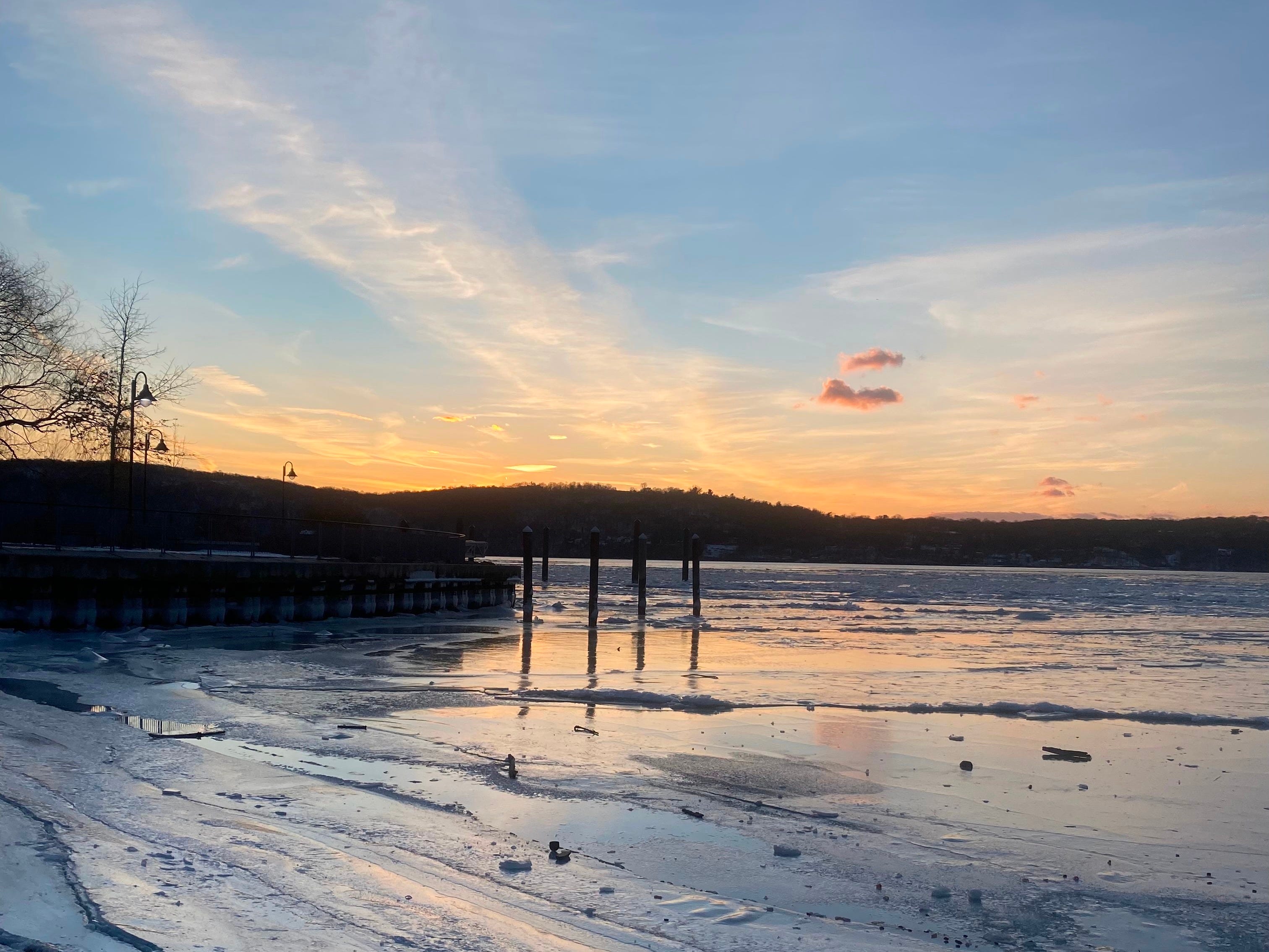 The wind is diamond sharp on our faces. The sun, like a pearl in a shell, gleams down. The Hudson is thick with ice, which breaks off in chunks and flows towards the ghost outline of Manhattan on the horizon. Moonchild pries a stick out of the dirty playground snow and heads off towards some bushes.