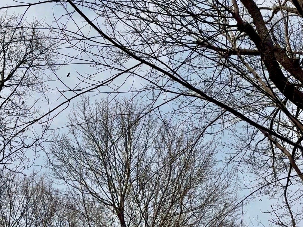 Whenever I look up, I begin to see the hawks. Above the river, above the tree line, the roads, the houses. I try to identify them but they’re high up, and I don’t know enough to be able to tell if they’re a red-shouldered hawk, a red-tailed hawk, or one of the other types that Google tells me are common here in New York state.